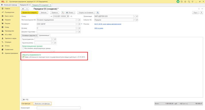 Для того чтобы в программе отразить реализацию объекта недвижимости переходим в раздел «ОС и НМА» – «Передача ОС» - «Создать» - заполняем документ. На закладке «Дополнительно» установите флаг «Право собственности переходит после государственной регистрации».