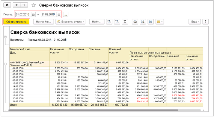 Красным цветом выделены суммы банковских выписок, не совпадающие с базой данных.