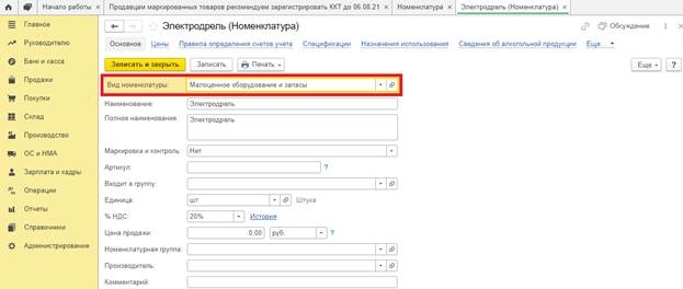 Для корректного учёта малоценного объекта в программе необходимо в карточке номенклатуры в поле «Вид номенклатуры» указать «Малоценное оборудование и запасы».