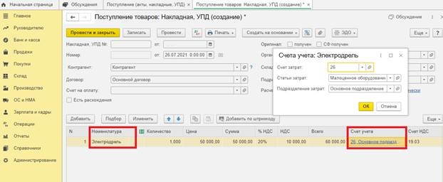 В документе «Поступление (акты, накладные, УПД)» при выборе номенклатуры «Электродрель» колонка «Счёт учёта» автоматически заполнится счётом учёта и статьёй затрат.