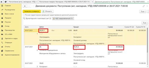 После проведения документ сформирует проводки:
