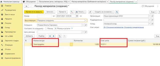 Списание стоимости по налоговому учёту произойдёт при передаче малоценного оборудования в эксплуатацию или при ином выбытии. Создаём документ «Расход материалов», в котором необходимо указать счёт и статью затрат.