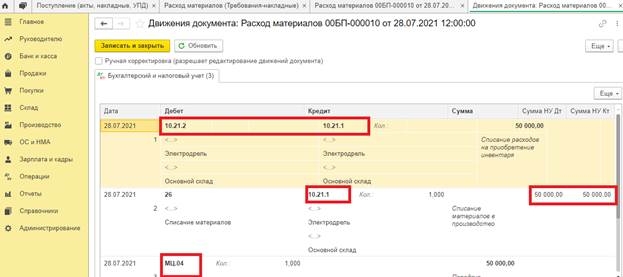 Так как объект «Электродрель» будет передан сотруднику, то сформируется проводка по забалансовому счёту МЦ.04 по количеству и сумме в БУ.