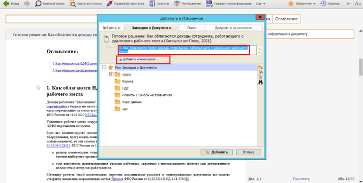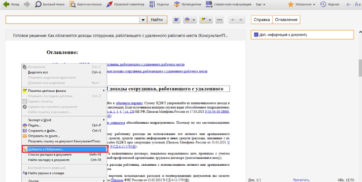 У пользователей КонсультантПлюс есть возможность формировать свою собственную библиотеку прямо в оболочке Системы, наработки будут храниться в «Избранном».