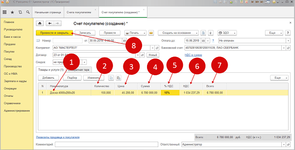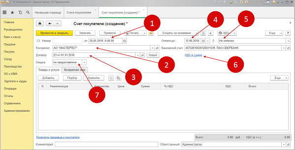 После заполнения основных реквизитов можно начать формировать непосредственно содержимое счёта в 1С.