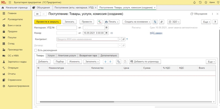 Внесение первичных документов в базу 1С:Бухгалтерия происходит следующим образом. Для отражения поступления открываем на панели разделов вкладку «Покупки» и нажимаем «Поступление (акты, накладные, УПД)». Для создания нового поступления необходимо нажать «Поступление» - «Товары, услуги, комиссия». Документ создается на основании предъявленного оригинала накладной и счета-фактуры от поставщика.
