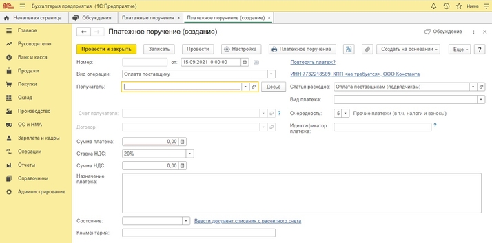 - Регистрируем оплату, то есть зачисление денежных средств на расчетный счет компании.