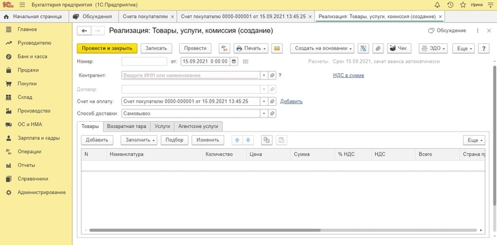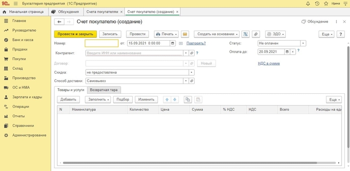 - Сначала выписываем счет покупателю, который согласился приобрести нашу продукцию оптом;