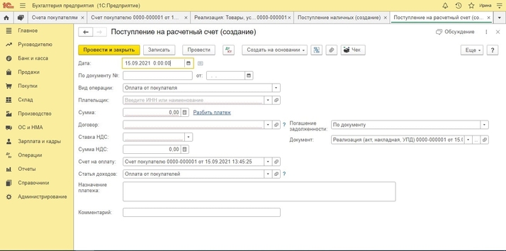 Следующий документ учета первички – оплата от покупателя. Оформление подобных документов производится либо на основании ранее созданных счетов на оплату, либо на основании документов реализации.