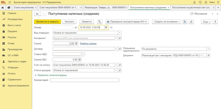 Если оплата происходит наличными, то создаем «Поступление наличных».