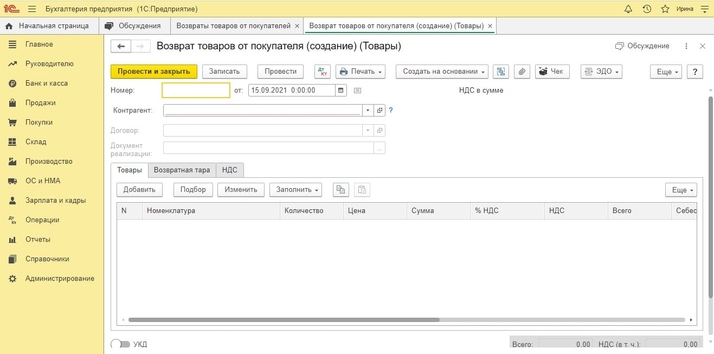 Для ввода возврата в информационную базу, необходимо зайти в раздел «Продажи» и нажать на вкладку «Возвраты о покупателей». Для создания нового документа нажимаем «Возврат» и в выпадающем окне выбираем нужную ссылку. Если покупатель уже оплатил за товары, то необходимо выбрать операцию «Товары», если товары были отгружены заранее, до выписки счета покупателю, то выбираем «Товары отгруженные».