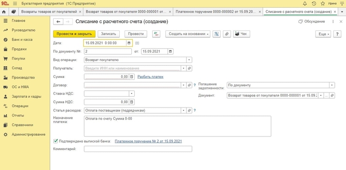 Данный учетный документ создается на основании созданного Возврата. Нужно найти и выделить этот документ и нажать на кнопку «Создать на основании» - «Платежное поручение».