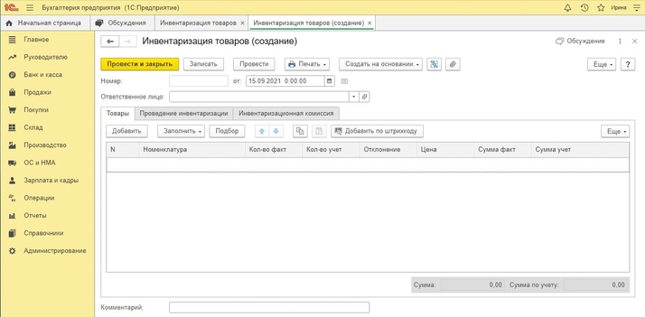 Выполним инвентаризацию на складе. В панели разделов нажимаем «Склад» и переходим по ссылке «Инвентаризация товаров» - «Создать».
