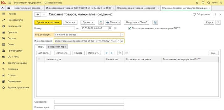 Для того, чтобы списать выявленную недостачу, необходимо зайти в доумент инвентаризации и нажать на кнопку «Создать на основании» - «Списание товаров, материалов».