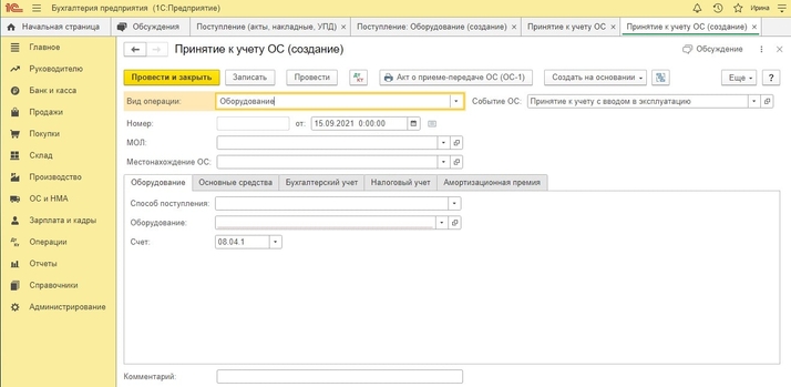 После того, как основное средство было оприходовано, необходимо ввести его в эксплуатацию, иными словами, принять к учету. Для этого, в программе необходимо выбрать «ОС и НМА» и нажать на вкладку «Принятие к учету ОС».