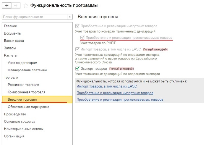 Изначально в программе необходимо включить возможность учёта товаров по РНПТ. Для этого зайдите в раздел «Администрирование» — «Функциональность» — «Торговля» — «Внешняя торговля» — поставьте галочку «Приобретение и реализация прослеживаемых товаров» (рис.1) либо в подразделе «Главное» можете поставить полную функциональность, тогда будут включены все возможности программы. Теперь в карточке основного средства (раздел «Справочники» – «ОС и НМА» — «Основные средства») во вкладке «Классификация» появился флажок «Прослеживаемый объект» (рис. 2). Поставьте данную галочку в случае, если основное средство или его комплектующая являются прослеживаемыми. Также необходимым полем для заполнения является ТН ВЭД.