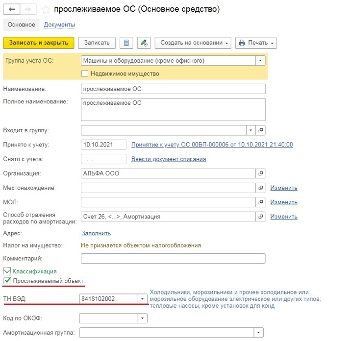 Если же для создания основного средства используется оборудование, то это будет справочник «Номенклатура», и там статус прослеживаемости указывается в поле «Маркировка и контроль».
