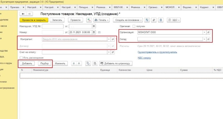 В программе 1С:Бухгалтерия предприятия оприходование товаров производится на вкладке «Покупки». Здесь выбирается пункт «Поступления (акты, накладные)» — по кнопке «Поступление» программа предлагает предопределённый список позиций. В зависимости от вида поступившей номенклатуры выбираете, какой документ будет создан. В текущем примере рассмотрим поступление товара, поэтому выбираем «Товары (накладная, УПД)». В шапке данного документа необходимо заполнить поля: «Контрагент», «Договор», «Склад» (в случае если в базе заведено несколько складов). В табличной части документа заполняете номенлатуру, её количество и цену, сумма будет рассчитана автоматически. Поле «% НДС» обычно заполняется автоматически, но при необходимости можете изменить ставку вручную.