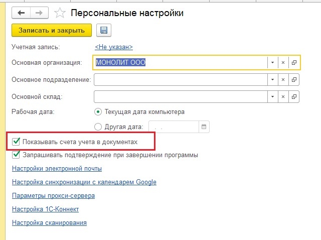 Правее есть столбец «Счёт учёта» (если он отсутствует, то зайдите в раздел «Главное» — «Персональные настройки» — поставьте галочку «Показывать счета учёта в документах»).