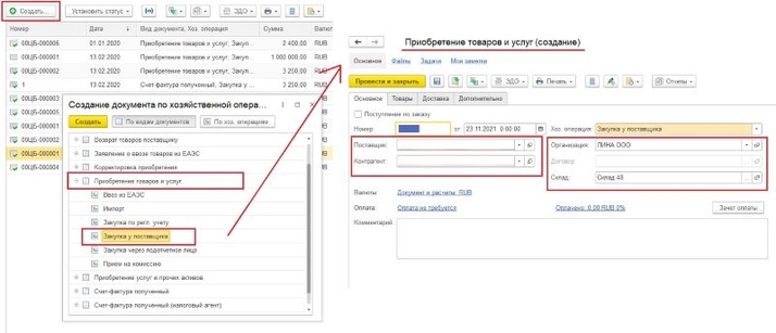 В программе 1С:Управление торговлей за поступление товаров и услуг отвечает раздел «Закупки» – подраздел «Документы закупки (все)». В данном подразделе откроется журнал документов закупки, в который необходимо добавить новый документ. Сделать это можно по кнопке «Создать» — «Приобретение товаров и услуг» — раскрываете на «плюс» и выбираете тип хозяйственной операции – в нашем примере это «Закупка у поставщика». При создании документа автоматически дата установилась равной текущей дате. На вкладке «Основное» заполняете данные о контрагенте и документ расчётов (договор, заказ, соглашение). Информацию о поступивших товарах указываете на вкладке «Товары». Заполнение табличной части документа может производиться путём подбора товаров в табличную часть документа (кнопка «Заполнить» – «Подобрать товары») или путём добавления товаров в табличную часть документа (кнопка «Добавить»).