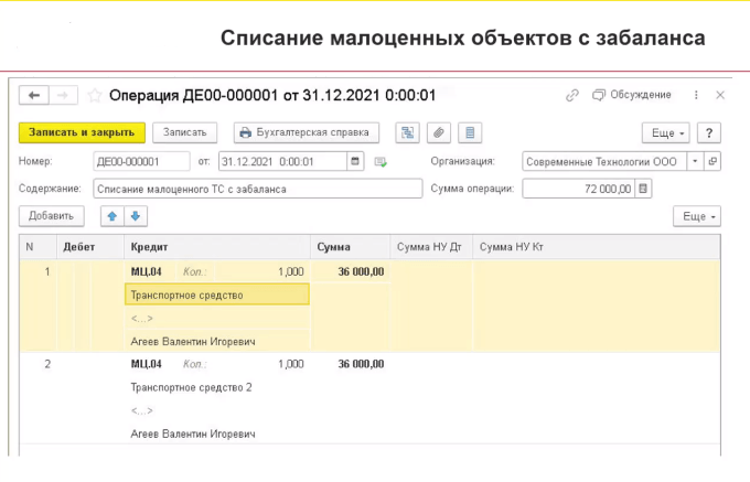 - Списать малоценные объекты, которые переводятся в состав основных средств с помощью документа «Операция»: