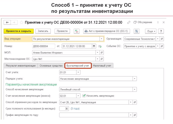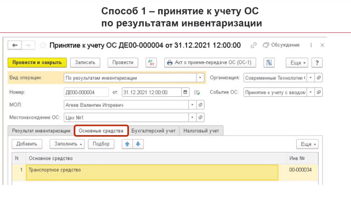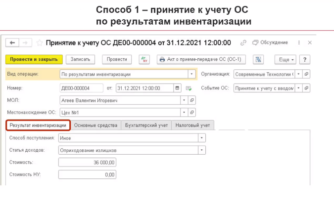 - Включённые указанные малоценные объекты в составе основных средств с помощью документа «Принятие к учёту ОС»: