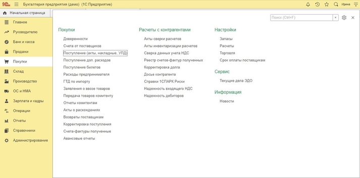 Чтобы создать новый документ в информационной базе, необходимо найти в меню основных разделов команду «Покупки» и выбрать ссылку «Поступление (акты, накладные, УПД)».