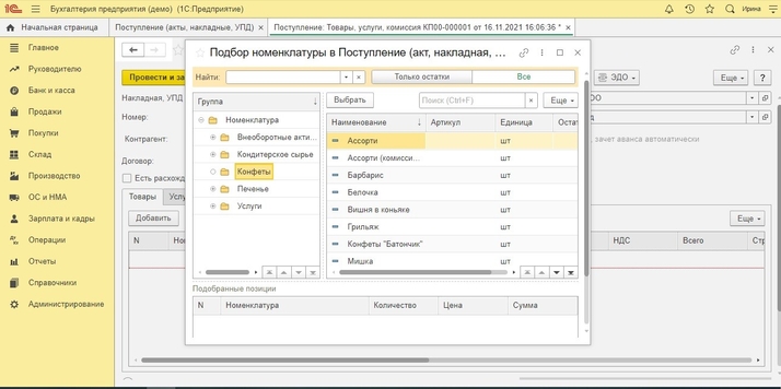Через справочник номенклатуры. Чтобы выбрать товары из справочника номенклатуры, нужно нажать на кнопку «Подбор», найти необходимый товар, указав количество по накладной. Цены заполняются автоматически. Затем нажать «Перенести в документ».