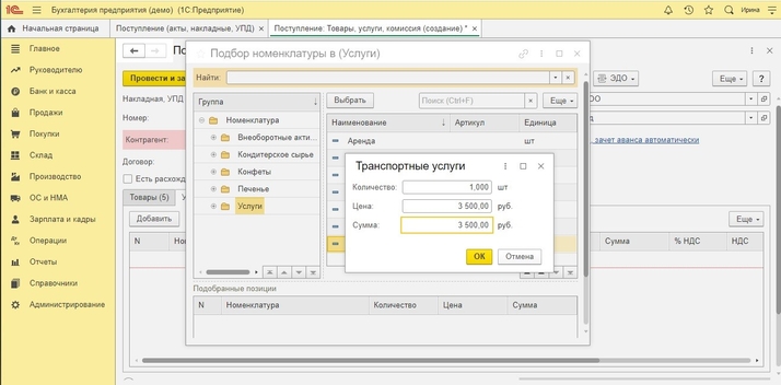 Предположим, что поставщик выполнил для нашей компании транспортные услуги. Для отражения данной операции необходимо в табличной части нажать на вкладку «Услуги» и с помощью кнопки «Подбор» добавить данную услугу в документ, указав её стоимость по предъявленному документу.