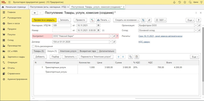 Также во вкладках «Возвратная тара», «Агентские услуги» указываются данные о дополнительных расходах, если таковые имеются.