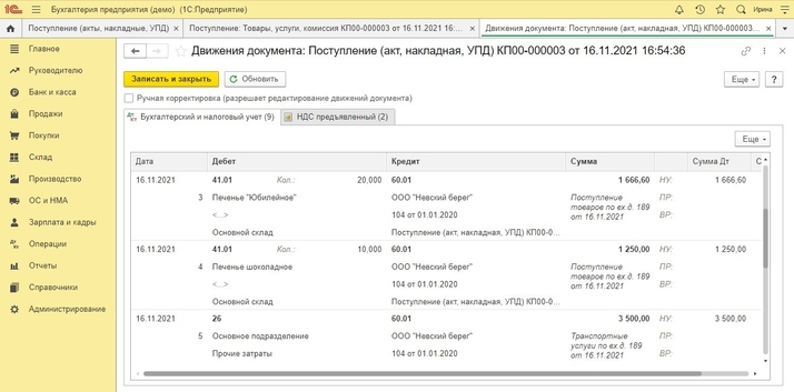 Важно помнить, что НДС не включается в стоимость товаров. Данный факт должен быть корректно отражён в программе 1С. Чтобы посмотреть, как отражается учёт поступления, обратимся к бухгалтерским проводкам. Нажмём на значок «Дт/Кт», расположенный в верхней части созданной нами накладной.
