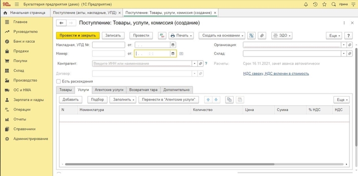 Рассмотрим пошаговую инструкцию учёта поступления товаров и услуг в программе 1С:Бухгалтерия 8.