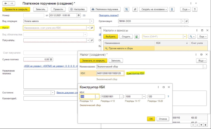 В программе 1С:Бухгалтерия 8 ред. 3.0 начисление экологического сбора оформляется с помощью документа «Операция», который находится в разделе «Операции» — «Операции, введённые вручную». Для уплаты сбора при создании платёжного поручения выбираем вид операции «Уплата налога» и далее формируем новый сбор по конструктору КБК: «Создать» – «Конструктор КБК» – по троеточию можно перейти в табличный поиск сбора.