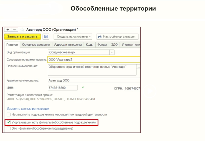 Для того чтобы функционал территорий был полноценным, необходимо в организации на закладке «Главное» установить флажок «У организации есть филиалы (обособленное подразделение)».