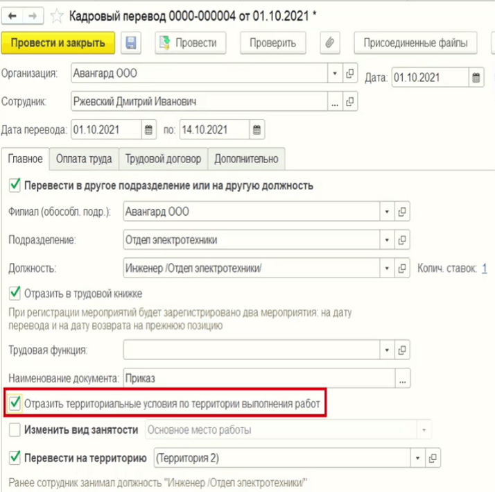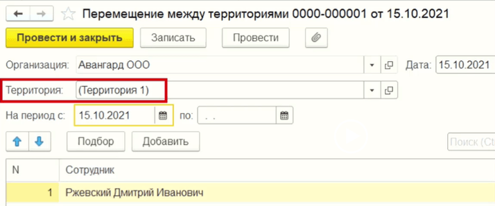 Помимо документов «Приём на работу» и «Кадровый перевод» существует документ «Перемещение между территориями», но этот документ имеет ряд особенностей: в документе отражаем территорию, на которую перемещаем сотрудника, период и в табличной части выбираете сотрудников, которых переводят на указанную территорию.
