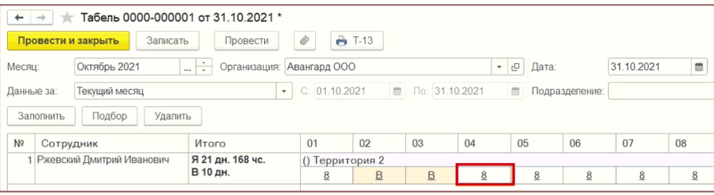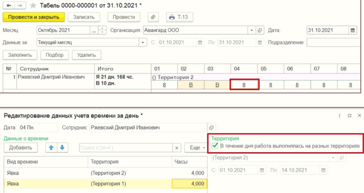 Также в документе «Табель» можно указать, с какого и по какое число сотрудник работал на отдельной территории, или в отдельный день. Можно установить флажок, что «Работа выполнялась на разных территориях».