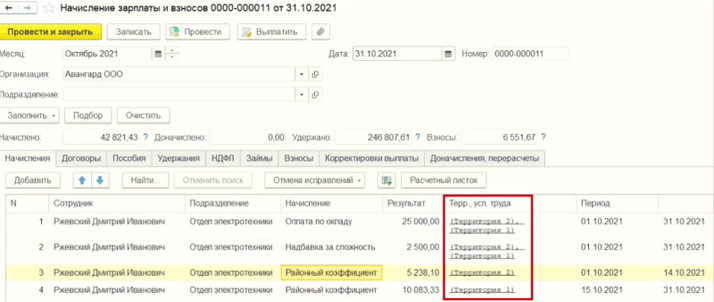 В документы, которые выполняют начисления, добавлена колонка с их распределением по территориям и в разовые начисления, таких как «Премия» и «Командировка», если у сотрудника на момент начисления были разные территориальные условия.