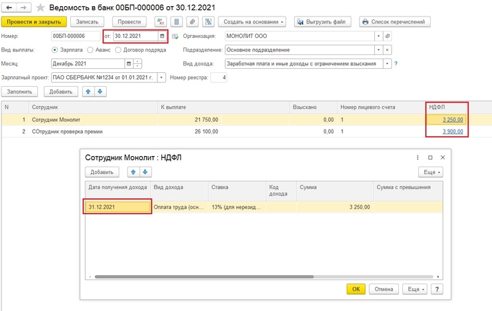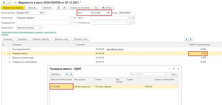 Далее создаём ведомость на выплату зарплаты за декабрь 2021 года от 30.12.2021. Если проверить удержание НДФЛ, то видно, что дата получения дохода и удержания налога стоит 31.12.2021.