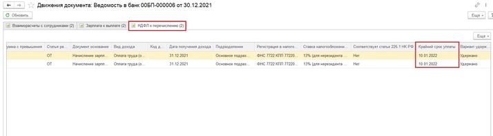 Для проверки сроков перечисления НДФЛ в программе можно перейти в раздел «Движение документа» ведомости и посмотреть регистр «НДФЛ к перечислению». По столбцу «Последний срок уплаты» увидим, что это дата после окончания праздников ‒ 10.01.2022.