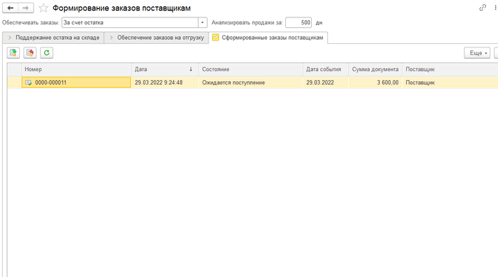 В нашем примере программа формирует заказ поставщику на двадцать упаковок чая «Майский» согласно предыдущим параметрам. Здесь же можно открыть сформированный заказ, проверить заполнение, провести.