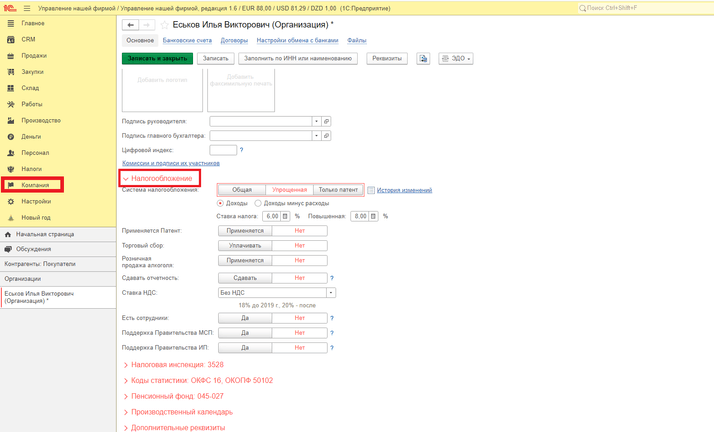 В разделе «Компания» – «Организации» открываем карточку организации, заходим в подраздел «Налогообложение», выбираем режим, который использует ИП.