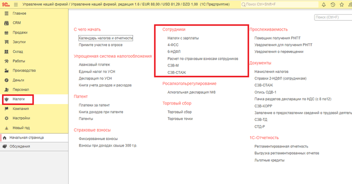 Для того чтобы вести отчётность по сотрудникам в разделе «Налоги» есть соответствующий блок «Сотрудники».