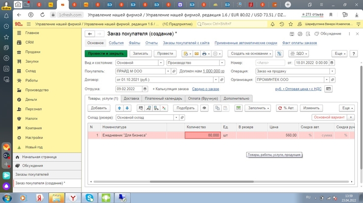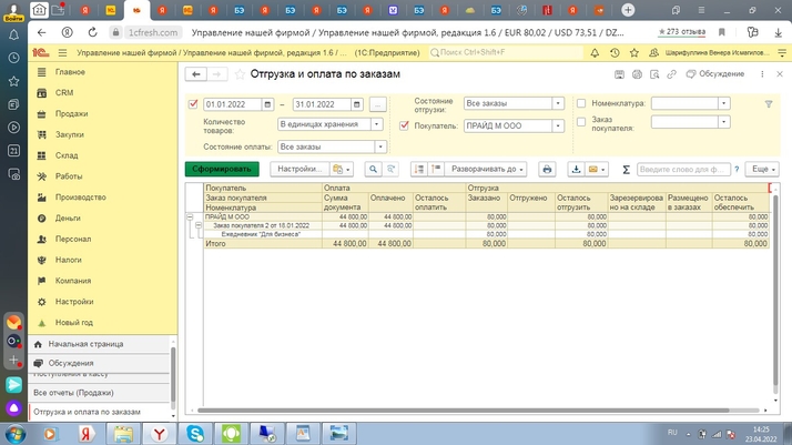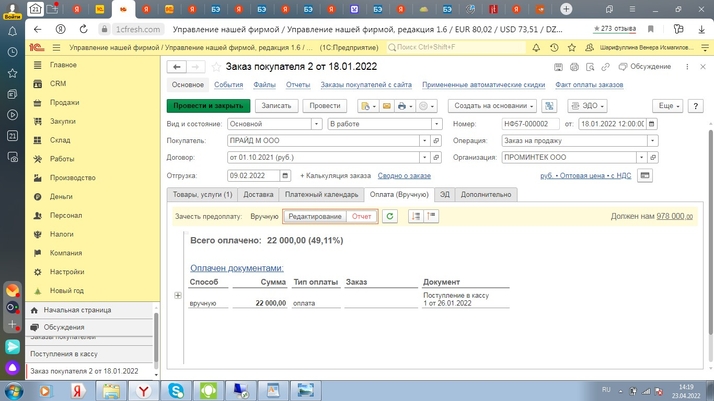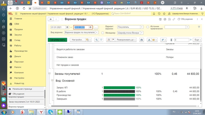 Давайте подведём итог рассмотрения нашей темы. В программе 1С:Управление нашей фирмой имеется функционал для анализа ведения учёта продаж. Реализована возможность проконтролировать этапы продаж с формирования заказа покупателя до проведения отгрузки; проконтролировать моменты безналичной и наличной оплаты; контролировать отражение этапов продаж отчётами в программе, вовремя отразив первичную документацию, от которых зависит правильность отражения информации в отчётах «Продажи». С программой можно работать как локально, так и в облаке 1С:Фреш, а в 2022 году облачную версию можно приобрести со скидкой 50% по акции для МСП. Если возникнут вопросы по работе в программе 1С:УНФ их можно задать, позвонив на горячую линию +7 499 956-21-70.