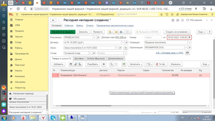 При формировании расходной накладной произойдёт автоматическое заполнение товарами и данными покупателя из заказа. После формирования сохраняем в программе по кнопке «Провести и закрыть». При проведении фиксируется списание указанного товара со склада, изменяются взаиморасчёты с клиентом и фиксируется выручка. По условиям работы с клиентом сформируем необходимые первичные документы: УПД, акт об оказании услуг, ТОРГ-12, счёт-фактура и др.