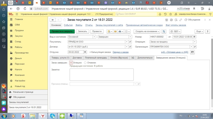 После получения от покупателя оставшейся суммы оплаты переведём заказ в статус «Завершён» с признаком успешного завершения и сохраним по кнопке «Провести и закрыть» (рис. 7).