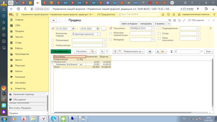Проверить этапы движения продаж в программе 1С:УНФ можно, проведя комплексный анализ. Увидеть информацию о полученной выручке и валовой прибыли даёт возможность сформировать отчёт «Продажи», расположенный в разделе «Продажи» по ссылке «Отчёты» (рис. 8).