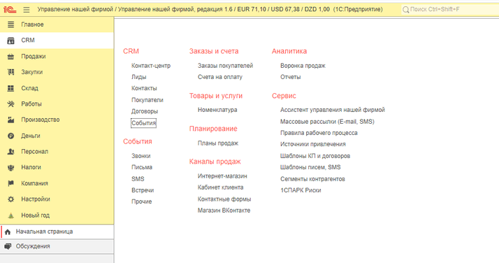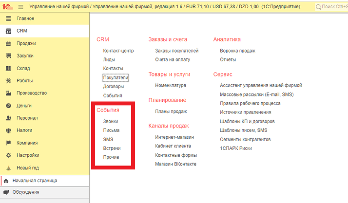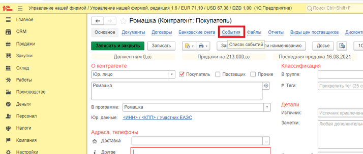 События, которые связаны с контрагентом, доступные из карточки контрагента, раздел «CRM» – «Покупатели» – синяя ссылка сверху «События», также списки различных видов событий доступны в разделе «CRM» в подразделе «События».