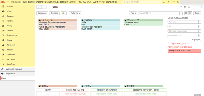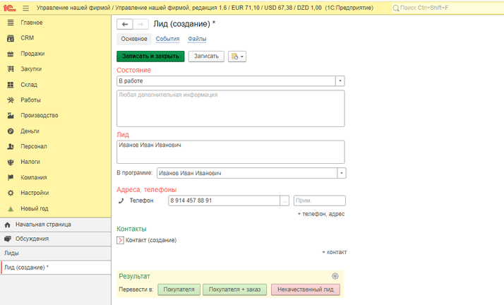 Каждому лиду присваивается состояние (не обработан, в работе). В карточке лида указываются контакты для связи, компания, юридическое название компании. По итогам работы на панели «Результат» менеджер выбирает действие: перевести покупателя, перевести в покупателя и создать заказ или скрыть.