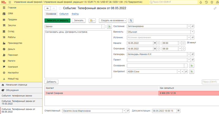Взаимодействия с клиентом отражаются в программе с помощью документа «Событие». Виды событий: телефонный звонок, встреча, электронное письмо, sms и пр.