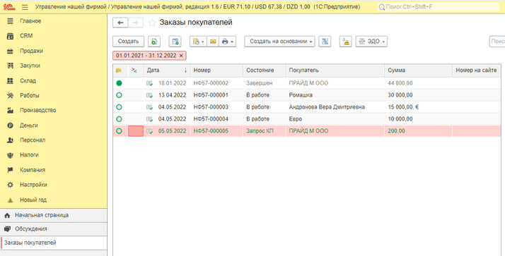 1С:Управление нашей фирмой ред. 1.6 есть блок CRM, который даёт менеджерам необходимые инструменты управления: работа с лидами; формирование заказов и счетов; постановка задач; отслеживание статусов по заказам и т. д.